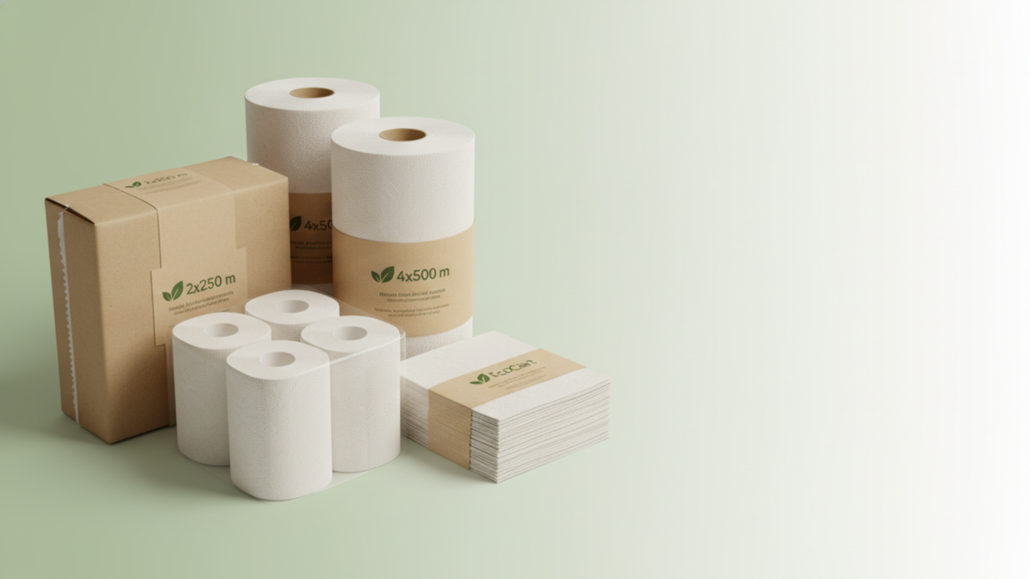 Toalla de papel 2x250 mt, Papel higiénico 4x500 mt, Toallas Interfoliadas.